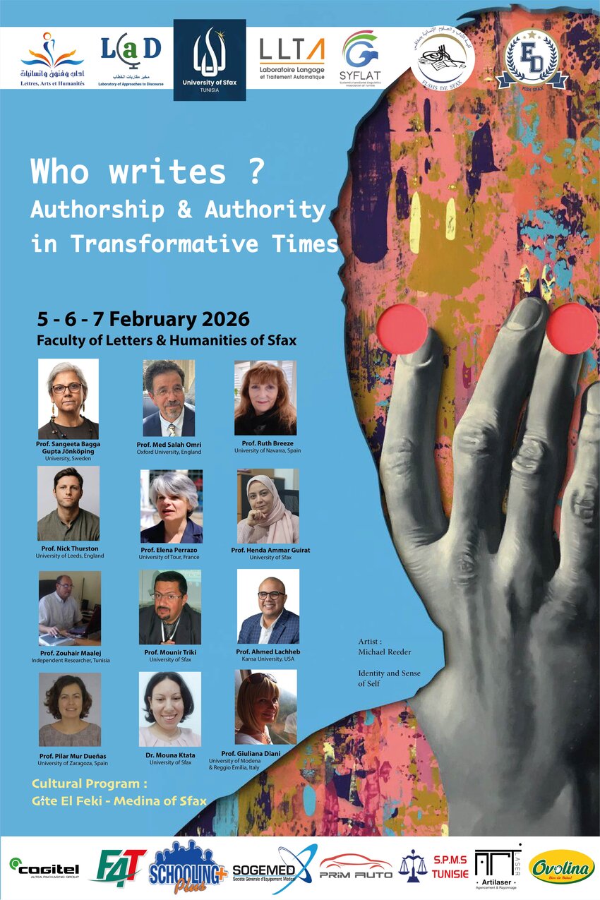 The event was organised by the joint collaboration between the Department of English, the Laboratory of Approaches to Discourse (LAD), the Laboratory of Language and Automatic Treatment and the Doctoral School at the Faculty of Letters and Humanities of Sfax. Its success was possible thanks to the concerted efforts of the conference coordinators, Radhia Besbes Krid and Sabiha Choura, as well as of the dedication from the scientific committee and from the directors of laboratories and associations, like Professor Akila Sellami (Director of the LAD) and Professor Fatma Benelhadj (Executive Member of SYFLAT).