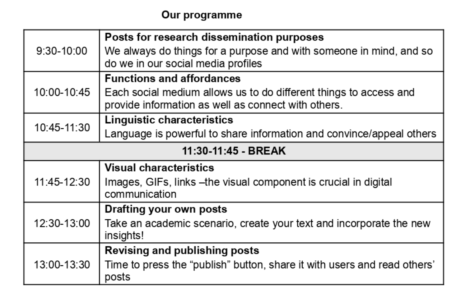 Our hands-on workshop offered a comprehensive session designed to equip researchers with practical skills for public transfer of specialised knowledge. First of all, we began by raising awareness of two generic aspects that are key to tailoring our messages: the purpose and the target audience. Then, we moved on to explore functions and affordances of the digital medium, like emoji language, and discussed the importance of choosing lexicogrammatical forms wisely. After the break, we analysed the communicative power of visual elements before the final activities, where participants had the opportunity to analyse and create their own posts, as well as give and receive peer feedback.